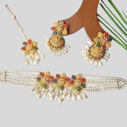 • Multi color flower set with beautiful jhumkas and pearl hanging.